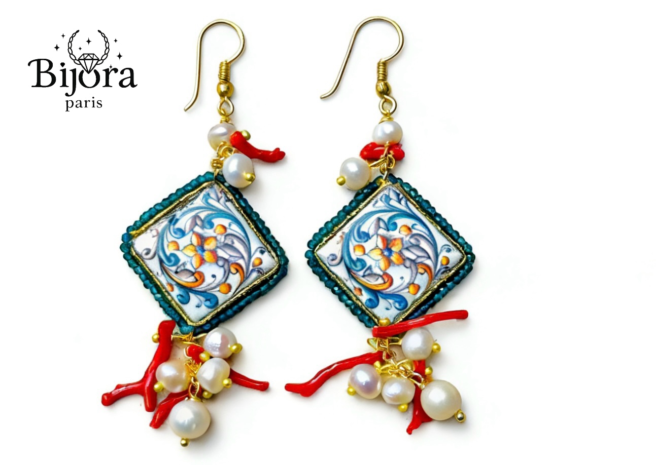 Le centre des boucles d’oreilles est orné de carreaux de céramique peints à la main (avec un support en pierre volcanique), de perles d’eau douce naturelles et de corail sardine.